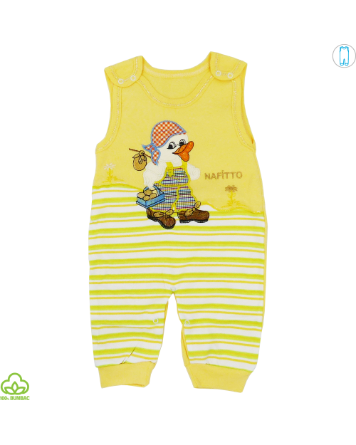 Compleu din bumbac, confortabil, pentru bebelusi nou nascuti de pana la 12 luni, de culoare alb-galben, cu imprimeu Ratusca.